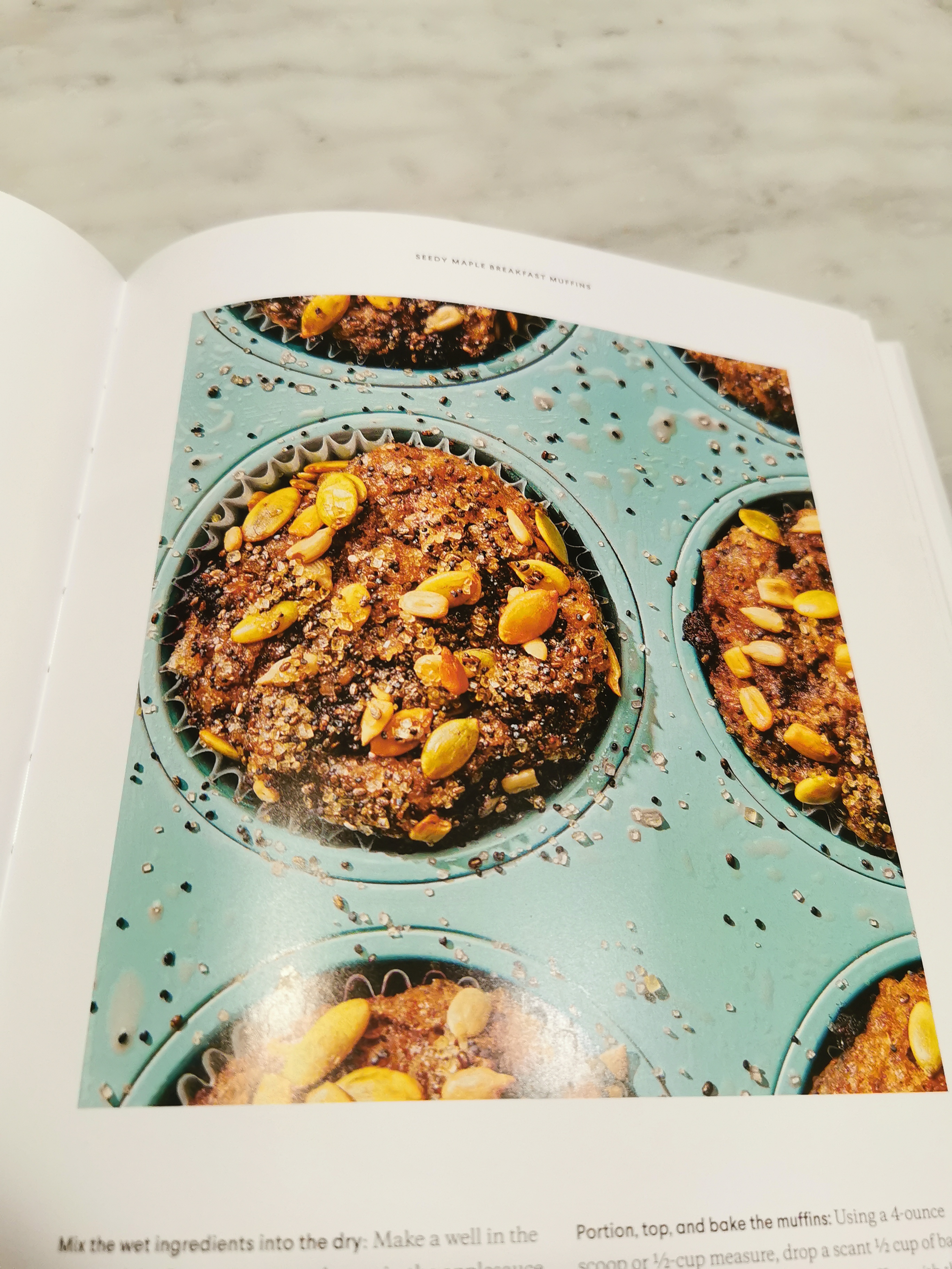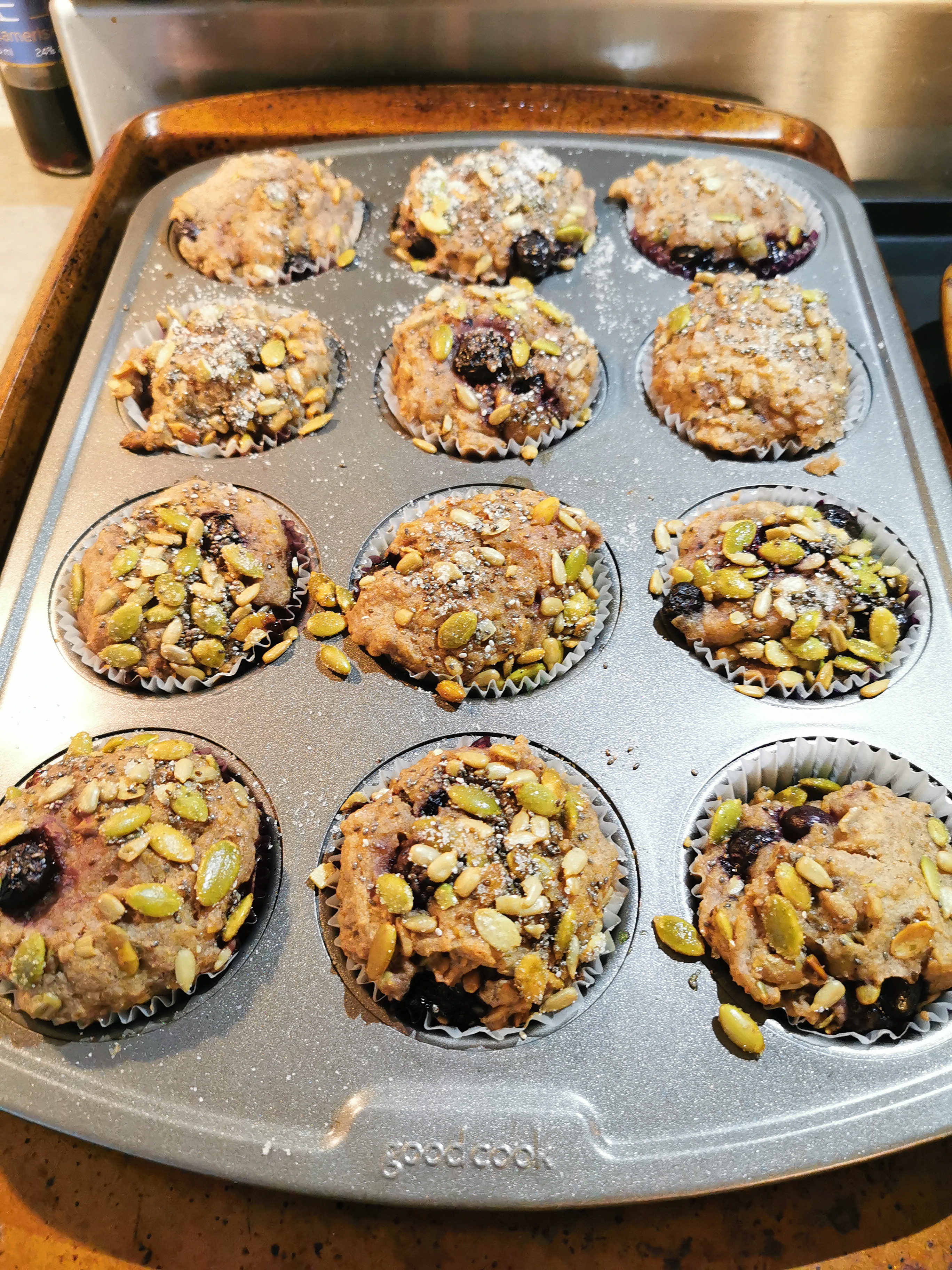 Mix the flour, baking soda and powder, salt and sugar with the applesauce. Add the flax egg then the seeds and berries.