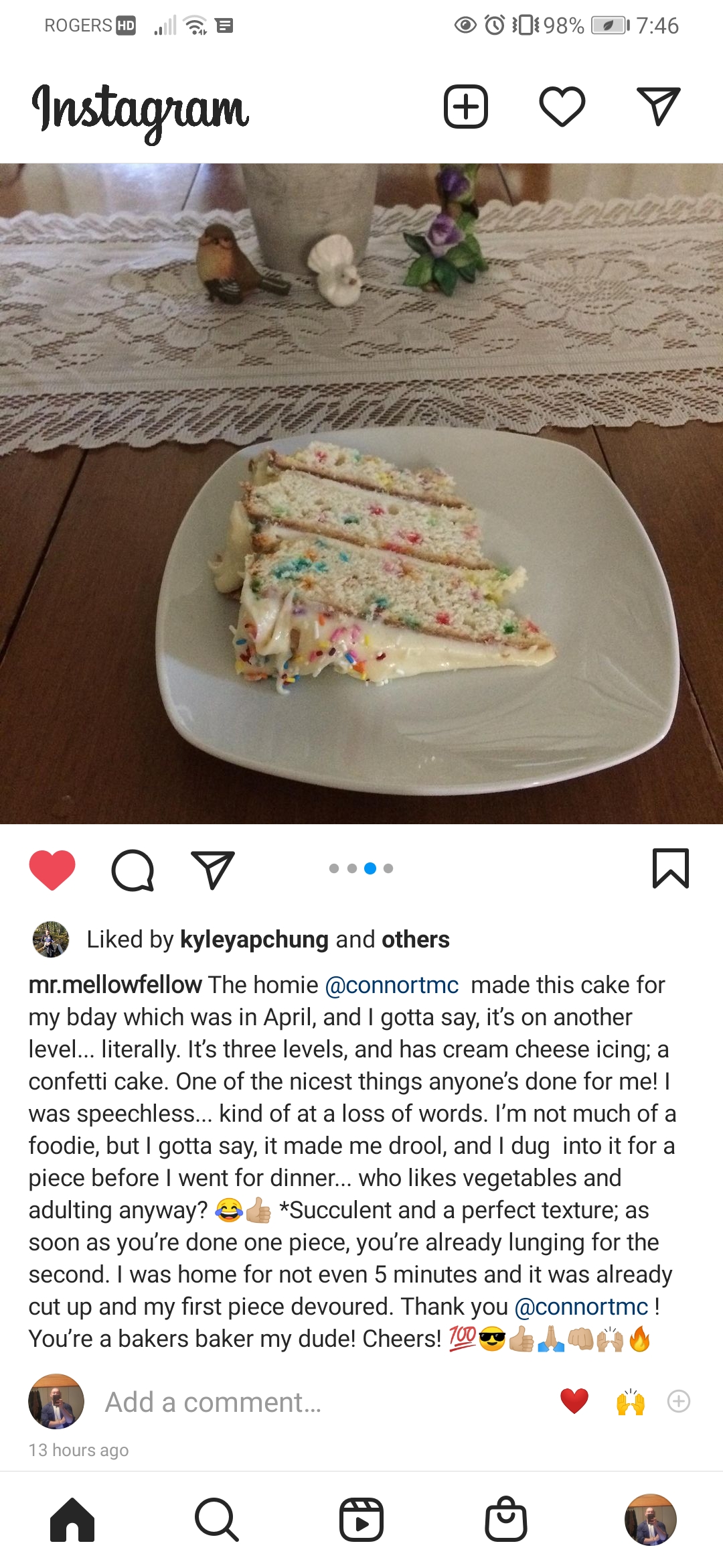 Funfetti Cake Posted byConnortmcMay 21, 2021May 21, 2021Posted inUncategorized Cream cheese icing! Flour, sugar, baking powder and soda, and salt Add oil and vutterMix! Add the eggs and vanilla and almond extracts in 2 batchesDivide into 3 pansLet the icing cool a bit then finish icing! Made this for my friend Jordan as a belated birthday present! It turned out great and the icing was delicious! Bonus pic of me eating all the scraps 😋 Share this: Share on X (Opens in new window) X Share on Facebook (Opens in new window) Facebook Like Loading... Related